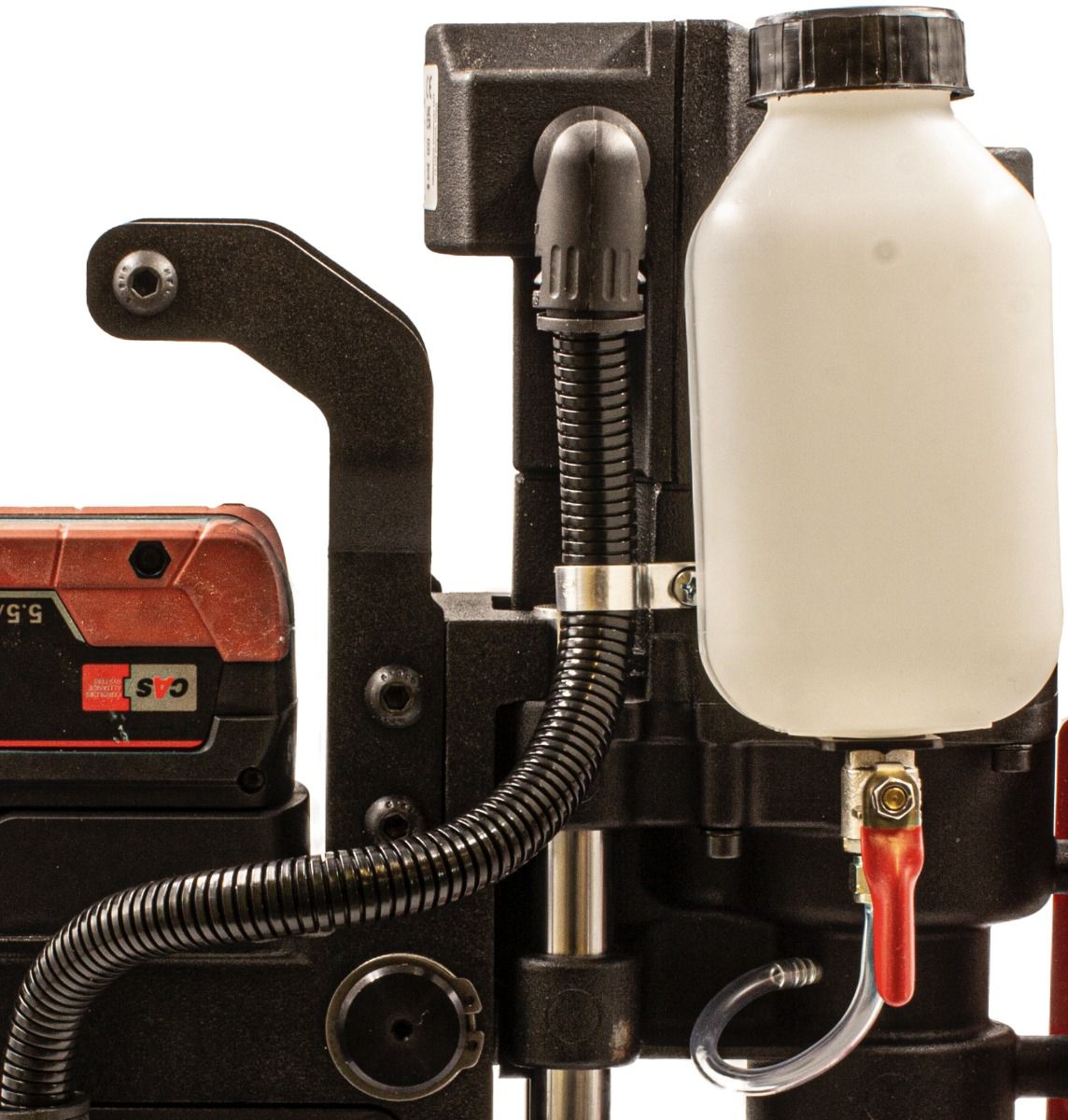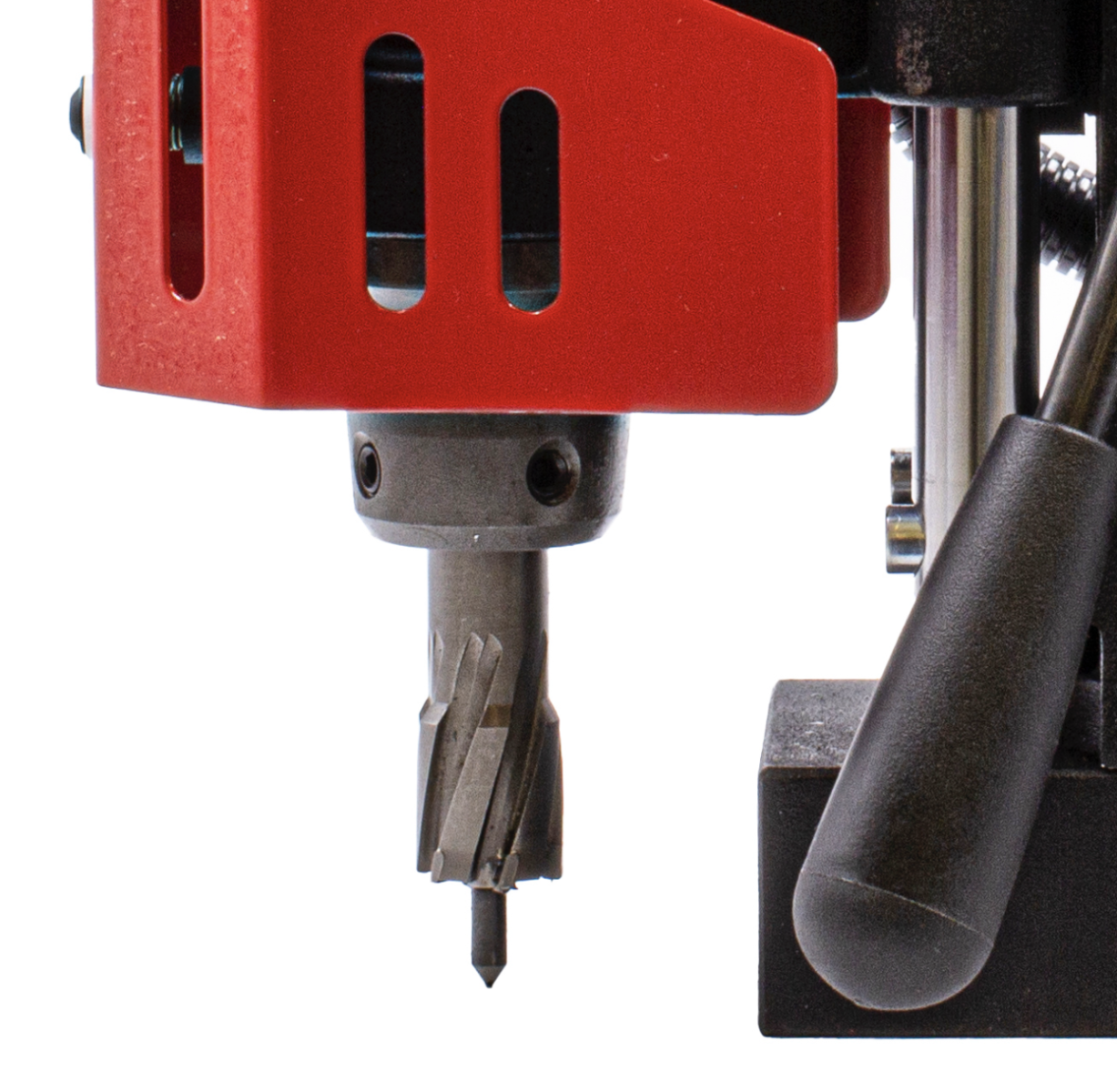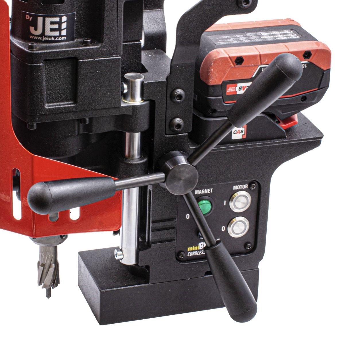 Battery-operated, compact magnetic drilling machine.
